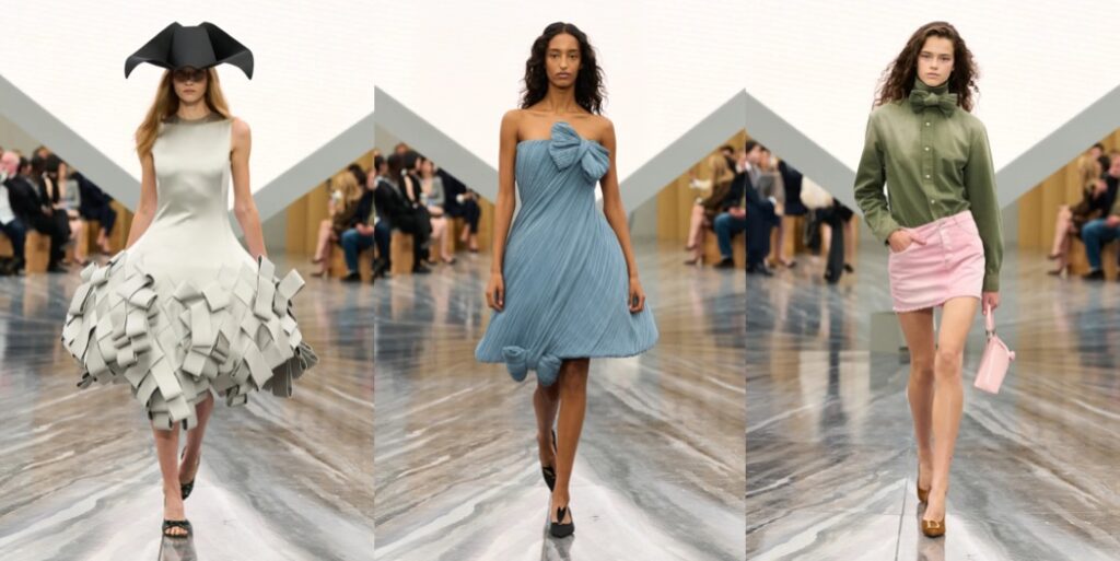Il primo look, totalmente bianco, sembra preparare lo sguardo a ciò che lo aspetta. Volumi, fiocchi e silhouette ad Y e A, uscite direttamente dagli anni 50, capeggiano la sfilata. I riferimenti sono ovvi, l’esecuzione sicuramente meno. La giacca Bar, rivisitata, viene abbinata a minigonne jeans, materiale utilizzato anche per le camice con fiocco, che vedremo in più look.