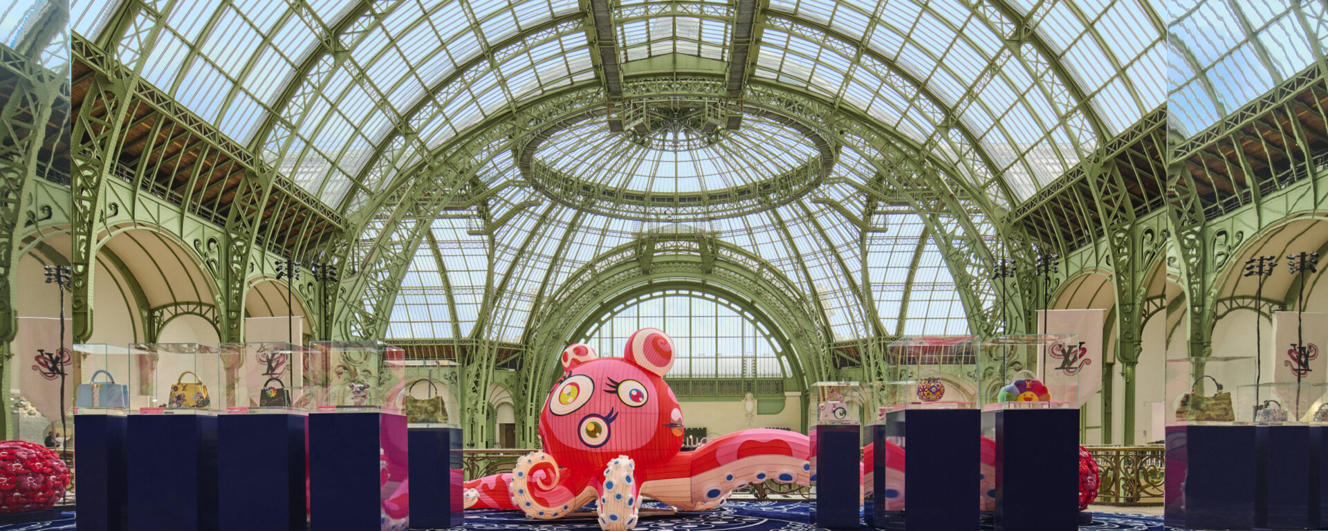 In occasione dell’Art Basel Paris, fiera di arte contemporanea allestita nella capitale francese dal 24 al 26 ottobre, Louis Vuitton ha scelto di presentare la terza collaborazione con l’artista giapponese Takashi Murakami, e non poteva farlo in modo più teatrale. Infatti, al Grand Palais è stato allestito un enorme polpo colorato, difficile da non notare. Non a caso è stato scelto l’animale marino, molto caro al creativo: in Giappone, oltre alla sfumatura erotica, gli vengono attribuiti i significati di perseveranza, successo e fortuna, proprio ciò che deriva da questa grandiosa intesa tra moda e arte. Oltretutto, è un tema caro all’artista, che ne ha già dato prova con la creazione di “The Octupus Eats Its Own Leg” nel 2001.