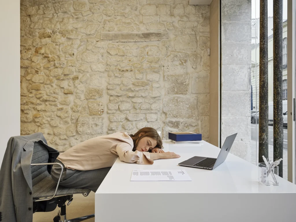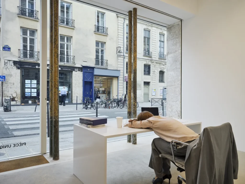 Art Basel Paris è ormai uno degli appuntamenti più attesi per gli amanti dell’arte contemporanea. Durante la settimana, la città apre le sue gallerie e artisti emergenti hanno la possibilità di far conoscere le proprie opere e visioni creative ad un pubblico internazionale. Nei quartieri dove l’arte contemporanea si concentra, dal Marais a Saint-Germain, passando per Belleville, si percepisce una frenesia elettrica, una corsa collettiva per esserci, mostrarsi e vendere. Ma se in ogni angolo si respira l’attesa e l’aspettativa, con inaugurazioni anticipate e vetrine tirate a lucido, in Rue de Turenne, nel cuore del Marais, qualcosa è diverso. Al numero 57, nella vetrina di Pièce Unique, la galleria di Massimo De Carlo, si vede un’assistente dormire appoggiata alla sua scrivania.