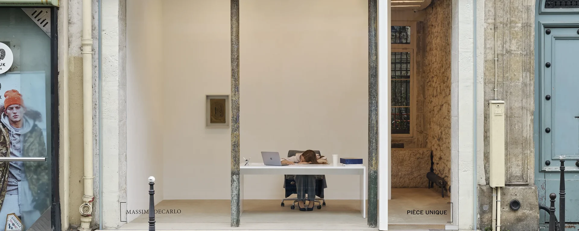 Art Basel Paris è ormai uno degli appuntamenti più attesi per gli amanti dell’arte contemporanea. Durante la settimana, la città apre le sue gallerie e artisti emergenti hanno la possibilità di far conoscere le proprie opere e visioni creative ad un pubblico internazionale. Nei quartieri dove l’arte contemporanea si concentra, dal Marais a Saint-Germain, passando per Belleville, si percepisce una frenesia elettrica, una corsa collettiva per esserci, mostrarsi e vendere. Ma se in ogni angolo si respira l’attesa e l’aspettativa, con inaugurazioni anticipate e vetrine tirate a lucido, in Rue de Turenne, nel cuore del Marais, qualcosa è diverso. Al numero 57, nella vetrina di Pièce Unique, la galleria di Massimo De Carlo, si vede un’assistente dormire appoggiata alla sua scrivania.