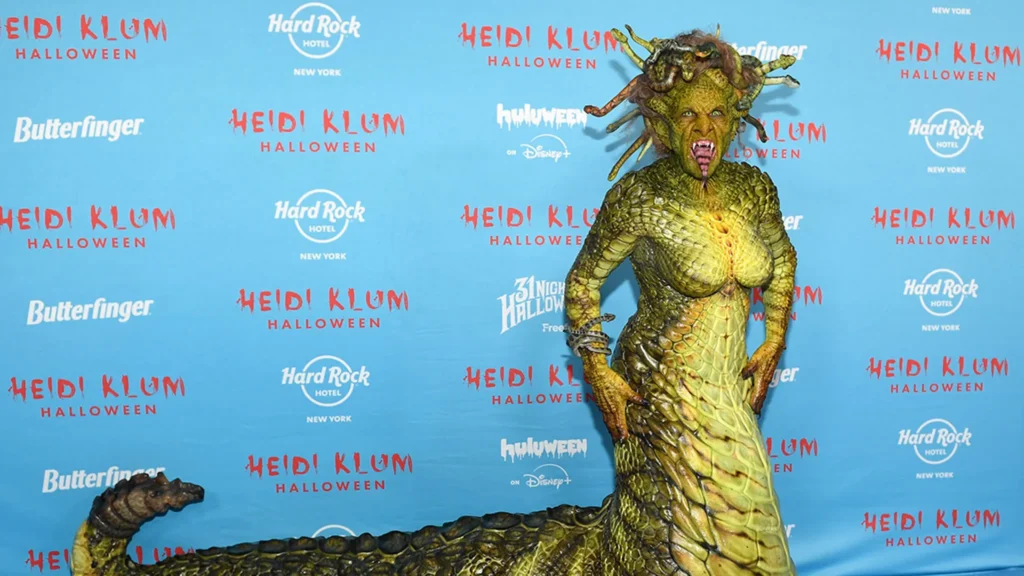 Per l’occasione, Heidi ha scelto di trasformarsi in Medusa, la creatura mitologica capace di pietrificare chiunque incontrasse il suo sguardo. Il costume, tra i più complessi mai realizzati dalla modella, ha richiesto oltre dieci ore di preparazione e il lavoro di un team di truccatori e artisti specializzati in effetti speciali cinematografici. Klum è apparsa completamente irriconoscibile, indossando un abito dorato con una straordinaria acconciatura intrecciata da serpenti metallici in movimento. Ogni dettaglio, dalle scaglie finte sulla pelle agli occhi verdi brillanti, è stato studiato per rendere la trasformazione perfetta.