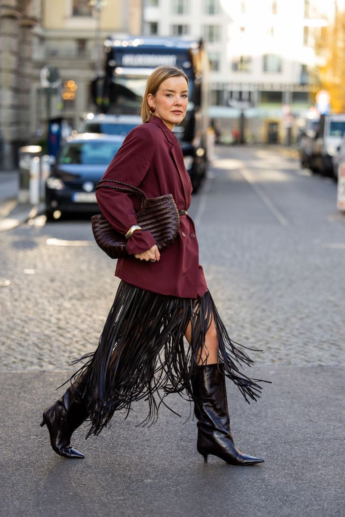 Gli accessori si adeguano a questa ricerca di comfort sensoriale. Le borse della stagione diventano morbide, tondeggianti, irresistibili al tatto. Il trend soft-touch restituisce un’idea di lusso discreto, intimo: la borsa non è più solo oggetto di design ma prolungamento del corpo, una carezza da portare con sé. Nelle tonalità neutre o nei pastelli cipriati, accompagna con armonia i look più strutturati. E mentre tutto sembra farsi più rilassato, torna con decisione il jeans skinny. Un classico apparentemente superato che, invece, riafferma la sua attualità. Vita medio-alta, lavaggi scuri, tagli puliti: lo skinny diventa la base su cui costruire contrasti di volume. Si porta con maglioni oversize, cappotti lunghi e stivaletti chunky. È un ritorno che parla di equilibrio tra tradizione e praticità.