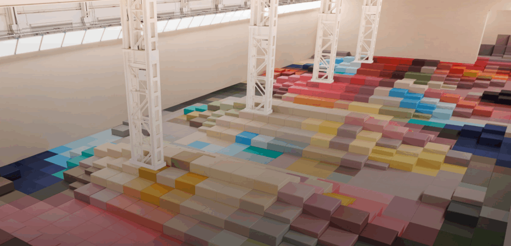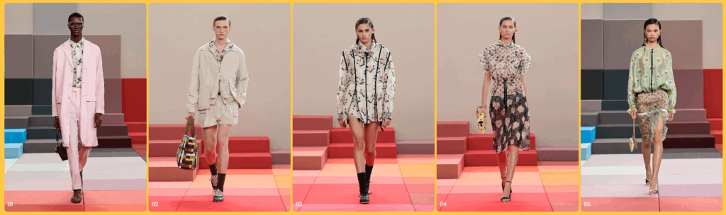 La sfilata ha avuto luogo nel nuovo quartier generale Fendi di Milano, in Via Solari 35, e lo spazio è stato allestito come un’installazione giocosa e futuristica: l’industrial designer Marc Newson ha creato una passerella immersa in blocchi multicolore che richiamavano una “pixel-maze”, un campo di “pixel” come sedute e struttura scenica.