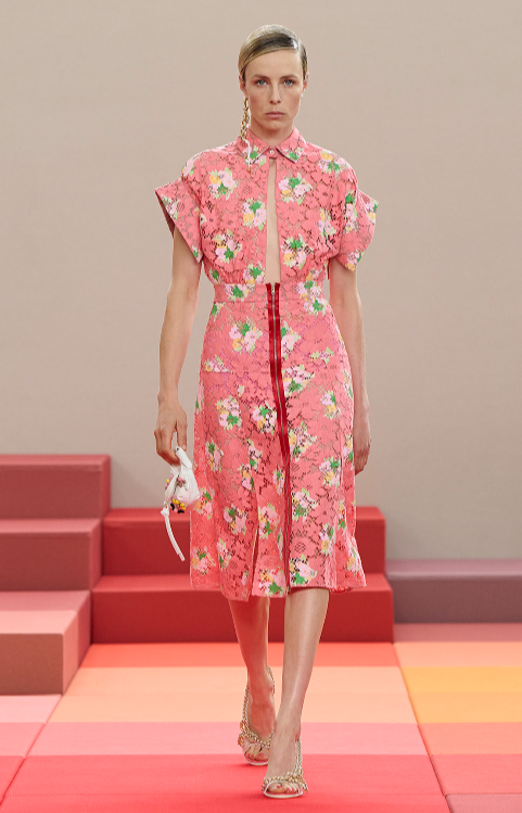 La collezione propone linee fluide, troviamo gonne plissé, abiti in organza, bomber con colletti voluminosi. Il romanticismo è filtrato da un senso di leggerezza: trasparenze, pizzi, tessuti liquidi e costruzioni più rilassate.