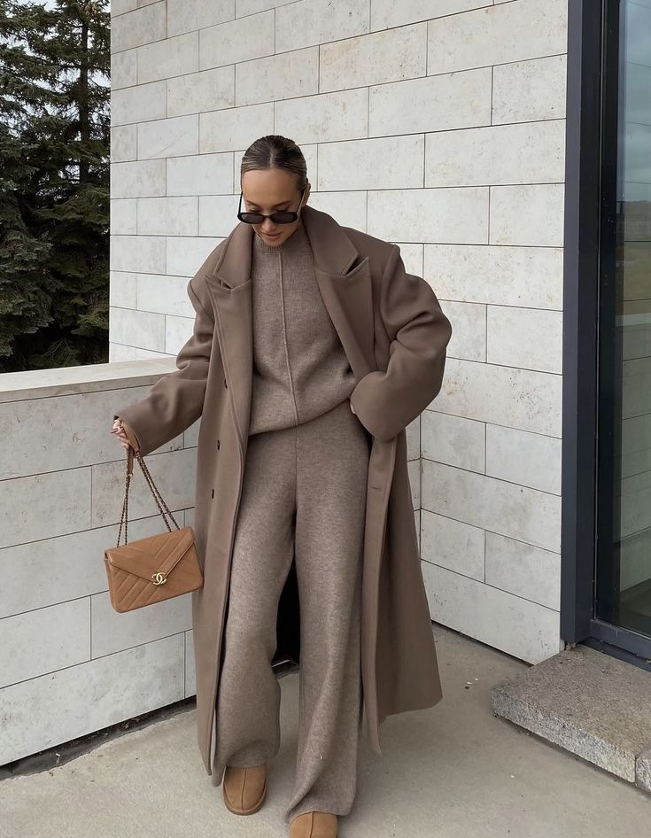 - Mood cozy: maglione oversize color cacao abbinato a pantaloni color crema o jeans chiari, per un’estetica rilassata ma curata.